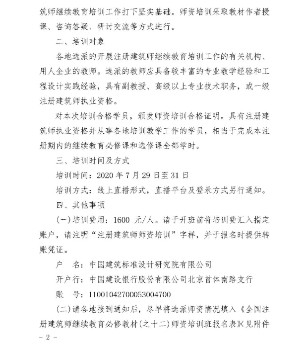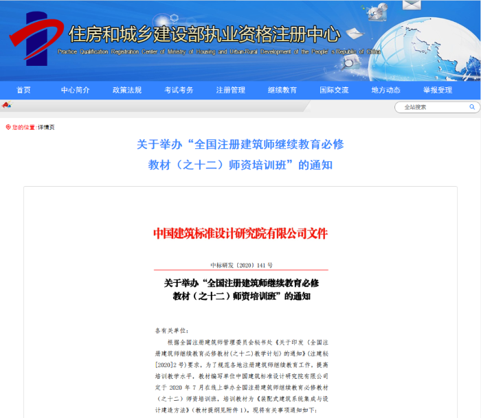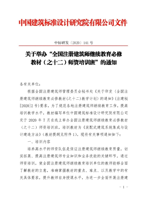 根據(jù)全國(guó)注冊(cè)建筑師管理委員會(huì)秘書(shū)處《關(guān)于印發(fā)〈全國(guó)注冊(cè)建筑師繼續(xù)教育必修教材(之十二)教學(xué)計(jì)劃〉的通知》(注建秘[2020]2號(hào))要求,為了規(guī)范各地注冊(cè)建筑師繼續(xù)教育工作、提高培訓(xùn)教學(xué)水平,教材編寫(xiě)單位中國(guó)建筑標(biāo)準(zhǔn)設(shè)計(jì)研究院有限公司定于2020年7月在線上舉辦全國(guó)注冊(cè)建筑師繼續(xù)教育必修教材(之十二)師資培訓(xùn)班(中標(biāo)研發(fā)[2020]141號(hào)),培訓(xùn)教材為《裝配式建筑系統(tǒng)集成與設(shè)計(jì)建造法》。