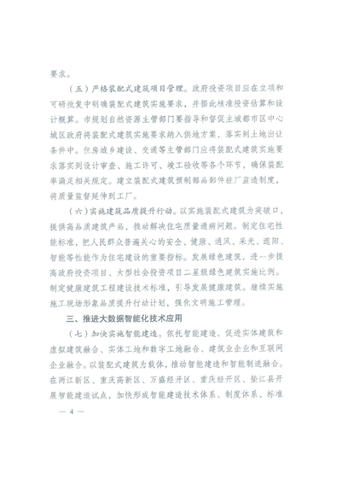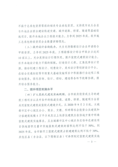 二、提升項(xiàng)目實(shí)施水平(四)擴(kuò)大裝配式建筑實(shí)施規(guī)模。全市政府投資或主導(dǎo)的建筑工程項(xiàng)目以及有條件的軌道交通、道路、橋梁、隧道項(xiàng)目全面采用裝配式建筑或裝配式建造方式。到2025年底,全市新開工裝配式建筑占新建建筑比例不低于30%。(五)嚴(yán)格裝配式建筑項(xiàng)目管理。建立裝配式建筑預(yù)制部品部件駐場建造制度,將質(zhì)量監(jiān)督延伸至工廠。(六)實(shí)施建筑品質(zhì)提升行動(dòng)。以裝配式建筑為突破口,提供高品質(zhì)建筑產(chǎn)品,推動(dòng)解決住宅質(zhì)量通病問題。制定住宅性能標(biāo)準(zhǔn),把人民群眾普遍關(guān)心的安全、健康、通風(fēng)、采光、遮陽、智能等性能作為住宅建設(shè)的重要指標(biāo)。發(fā)展綠色建筑,進(jìn)一步提高政府投資項(xiàng)目、大型社會(huì)投資項(xiàng)目二星級(jí)綠色建筑實(shí)施比例。制定健康建筑工程建設(shè)技術(shù)標(biāo)準(zhǔn),引導(dǎo)發(fā)展健康建筑。繼續(xù)實(shí)施施工現(xiàn)場形象品質(zhì)提升行動(dòng)計(jì)劃,強(qiáng)化文明施工管理。