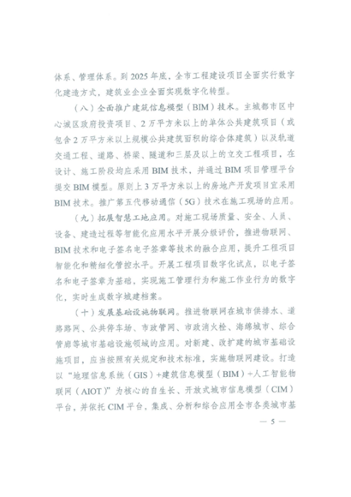 三、推進(jìn)大數(shù)據(jù)智能化技術(shù)應(yīng)用(七)加快實(shí)施智能建造。到2025年底,全市工程建設(shè)項(xiàng)目全面實(shí)行數(shù)字化建造方式,建筑業(yè)企業(yè)全面實(shí)現(xiàn)數(shù)字化轉(zhuǎn)型。(八)全面推廣建筑信息模型(BIM)技術(shù)。(九)拓展智慧工地應(yīng)用。對施工現(xiàn)場質(zhì)量、安全、人員、設(shè)備、建造過程等智能化應(yīng)用水平開展分級(jí)評(píng)價(jià),推進(jìn)物聯(lián)網(wǎng)、BIM技術(shù)和電子簽名電子簽章等技術(shù)的融合應(yīng)用,提升工程項(xiàng)目智能化精細(xì)化管控水平。(十)發(fā)展基礎(chǔ)設(shè)施物聯(lián)網(wǎng)。(十一)支持建筑業(yè)互聯(lián)網(wǎng)發(fā)展。發(fā)展第三方建筑云,推進(jìn)建筑業(yè)企業(yè)和工程建造活動(dòng)“上云上平臺(tái)”。