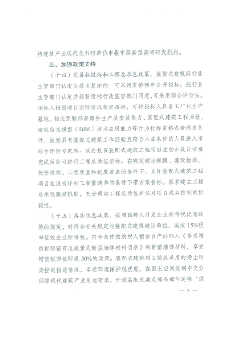 五、加強(qiáng)政策支持(十四)完善招投標(biāo)和工程總承包政策。(十五)落實(shí)優(yōu)惠政策。按照西部大開發(fā)企業(yè)所得稅優(yōu)惠政策的規(guī)定,對符合有關(guān)規(guī)定的裝配式建筑建設(shè)單位,減按15%稅率征收企業(yè)所得稅。