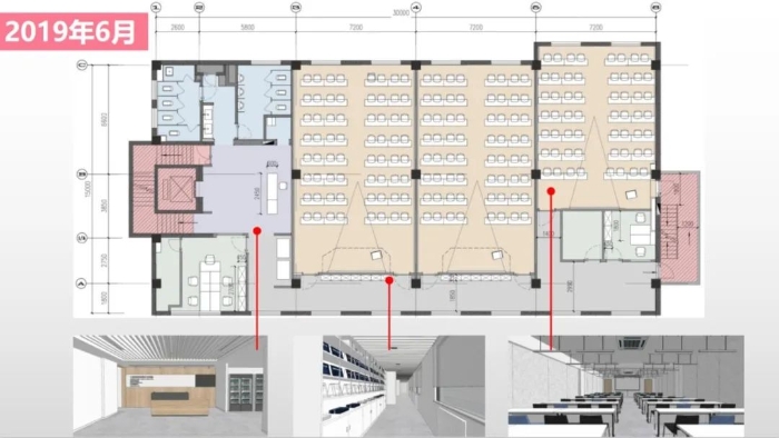 疫情到來(lái)之前學(xué)校為了滿(mǎn)足多多開(kāi)班、同時(shí)開(kāi)班、大量招生的要求,設(shè)計(jì)了三間大教室,支持我們大量的面授教學(xué)。剛想加上小書(shū)店和教師休息室,再把方案調(diào)一調(diào),結(jié)果新冠就來(lái)了。