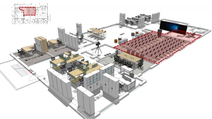 現(xiàn)場(chǎng)教學(xué)滿(mǎn)足70人面授,配有導(dǎo)播臺(tái)可以同步直播在線聽(tīng)課,座位靈活排布,根據(jù)疫情不同階段控制現(xiàn)場(chǎng)人數(shù)和安全間距;