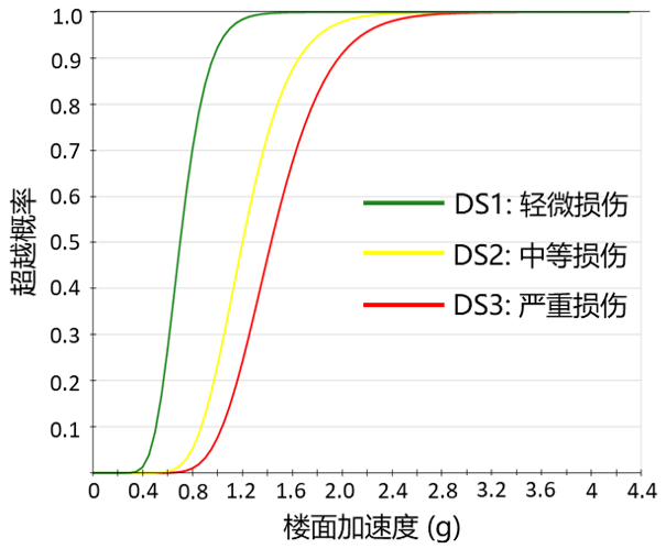 上圖為某一鋼筋混凝土梁柱構(gòu)件的易損性曲線,橫軸為最大層間位移角,縱軸為構(gòu)件在不同損傷狀態(tài)(Damage State, DSi)下的超越概率。為了方便理解,這里以層間位移角為4%為例來說明。圖中A、B、C、D的高度分別代表了當(dāng)最大層間位移角為4%時,該類構(gòu)件未發(fā)生損傷、發(fā)生輕微損傷、發(fā)生中等損傷與發(fā)生嚴(yán)重?fù)p傷的概率。下表中給出了不同損傷狀態(tài)的描述。