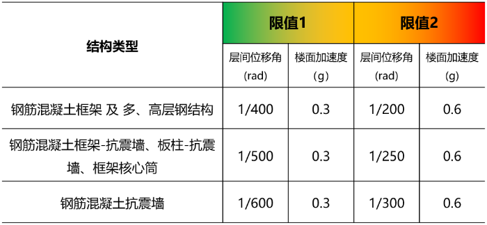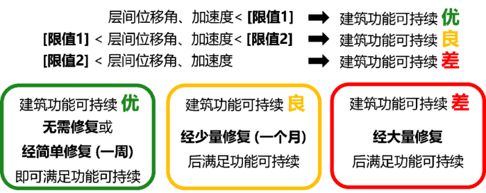為了解決以上提到的三點問題,這里嘗試建立相對明確的層間位移角和樓面加速度限值,以將建筑功能可持續(xù)性分為優(yōu)、良、差三個等級,以極大方便在實際工程中考慮建筑抗震韌性的問題。
