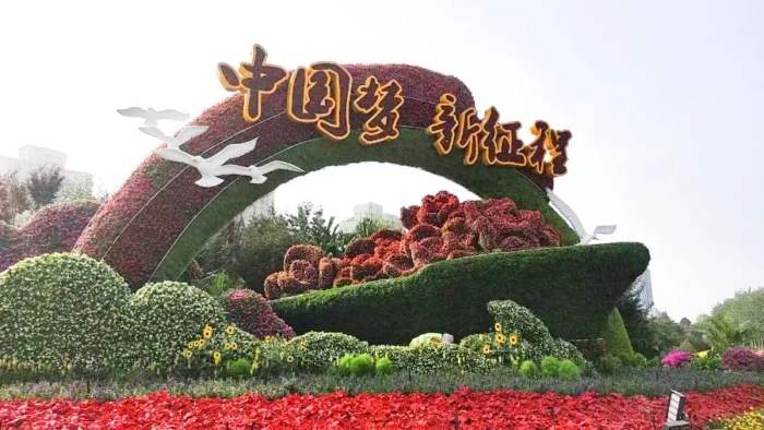 花壇以載滿鮮花的巨輪、嵌有“中國夢 新征程”的彩虹門為主景,寓意乘勢而上,開啟全面建設(shè)社會主義現(xiàn)代化國家新征程,向第二個(gè)百年奮斗目標(biāo)進(jìn)軍。