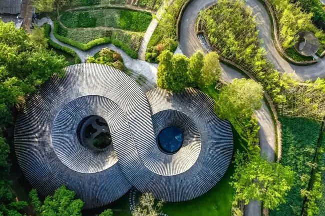 俯瞰竹里,像是一個被竹林包裹著的臥倒的數(shù)字8,它是一個無限符號。在郁郁蔥蔥的竹林中,青磚黛瓦與竹林、樹木、蜿蜒的鄉(xiāng)間小路相互交融,相得益彰。竹里的建筑內(nèi)部更是曲徑通幽,8字的兩個圓圈分別是水景與山景兩個中庭天井,營造出了傳統(tǒng)藝術(shù)與生活美學(xué)的無限與融合。