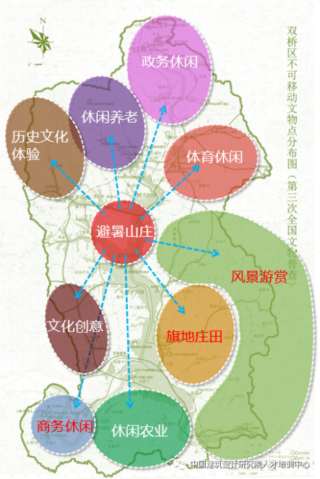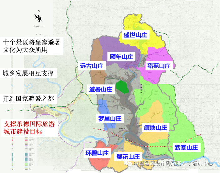 規(guī)劃從內(nèi)到外向溝域延展,形成九大功能拓展產(chǎn)業(yè),十個(gè)景區(qū)將皇家避暑文化為大眾所用。城鄉(xiāng)發(fā)展相互支撐,實(shí)現(xiàn)了打造國家避暑之都,支撐承德國際旅游城市建設(shè)的目標(biāo)。