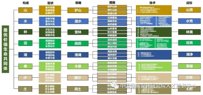生態(tài)修復(fù)本著保護優(yōu)先、節(jié)約優(yōu)先、以自然恢復(fù)為主的方針,按照“謀劃定位、策劃功能、規(guī)劃塑形、計劃落地”四劃協(xié)同的工作方法,創(chuàng)新“摸清本底、自然恢復(fù)、生態(tài)修復(fù)、生物多樣性、生態(tài)設(shè)施、綠色建筑”六大生態(tài)規(guī)劃邏輯,抓住“水”和“土”兩個生態(tài)核心要素,以“留水-固土”為切入點,結(jié)合“護山-理水-營林-疏田-清湖-豐草-固沙”七大策略,綜合運用成熟、成套、低成本的生態(tài)技術(shù)、材料、產(chǎn)品、工法,形成一套可復(fù)制、可推廣的標(biāo)準(zhǔn)、標(biāo)準(zhǔn)圖、導(dǎo)則、指南,始終聚焦生態(tài)的風(fēng)景和風(fēng)景的生態(tài),建設(shè)以生態(tài)為魂、以風(fēng)景為象的,人與自然和諧共生的最優(yōu)價值生命共同體。