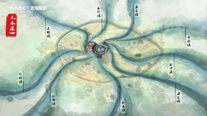 嘉興具有1800年的悠久歷史,積累了豐富的文化資源,包括紅船文化、紅色文化、運河文化、農(nóng)耕文化、歷史名人資源等。嘉興的名人在中國文化史上有著非常高的地位,包括國學大師王國維、武俠小說家金庸、詩人徐志摩、作家茅盾、畫家豐子愷等等。但是嘉興的歷史文化遺存并沒有成規(guī)模地、整體地保留下來,這也是中國城市中的一個普遍現(xiàn)象。我們團隊對嘉興的歷史文化進行了系統(tǒng)的梳理和挖掘。嘉興古城呈現(xiàn)出了非常有特色的空間格局,其面積約3.4平方公里,四周被運河環(huán)繞,是唯一一個被京杭大運河環(huán)繞一周的古城。而古城內(nèi)部的歷史遺存是散落的、點狀的。我們稱古城在整個城市當中的定位為“九水連心”,挖掘出的嘉興最大的城市特色也是“水”。嘉興以南湖為核心,蘇州塘、新塍塘、杭州塘、長水塘、海鹽塘、長中港、平湖塘、嘉善塘、長纖塘九大水系呈放射狀布局,構(gòu)建起整個城市的空間結(jié)構(gòu),展現(xiàn)了江南水鄉(xiāng)獨特的蛛狀水網(wǎng)和獨特的圩田聚落格局。通過系統(tǒng)性的本底規(guī)劃研究,從人因工程學的系統(tǒng)、自然、生態(tài)等特點出發(fā),我們用“九水連心”來構(gòu)架這個城市。