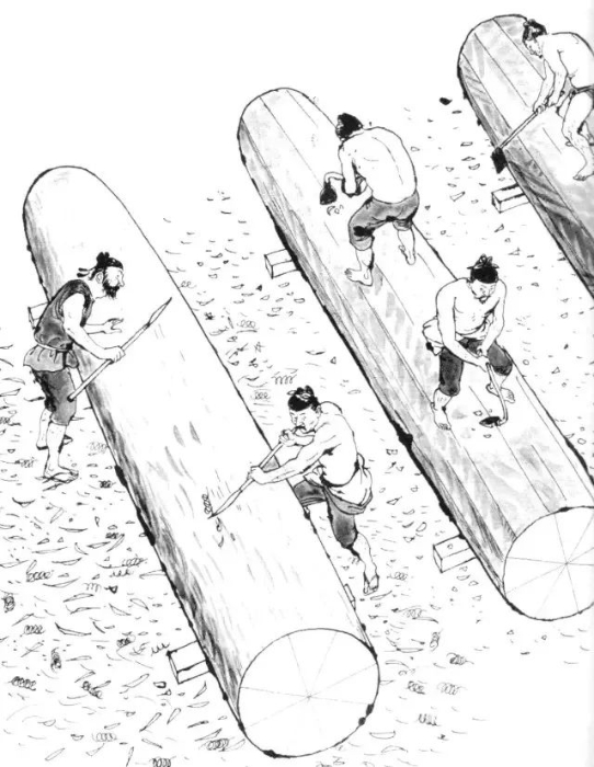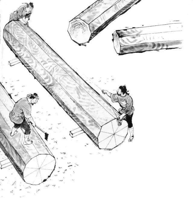 ▲ 按照需要的尺寸,把木頭加工成柱子。