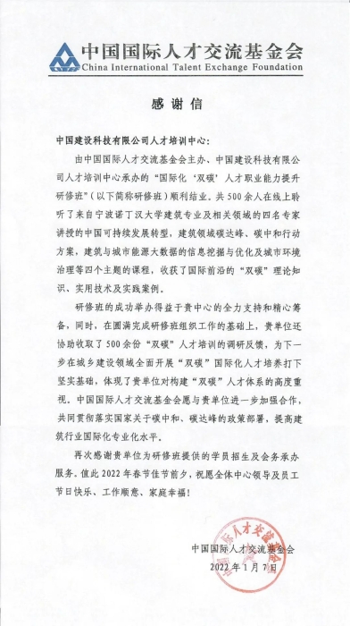 2022年新春來臨之際,中國國際人才交流基金會向中國建設(shè)科技有限公司人才培訓(xùn)中心(以下簡稱“中心”)發(fā)來感謝信,對我中心于2021年12月29-30日承辦的"國際化'雙碳’人才職業(yè)能力提升研修班"(以下簡稱研修班)的精心籌備,以及我中心對構(gòu)建“雙碳”人才體系的高度重視給予了高度評價,并對我中心對研修班的全力支持表示衷心感謝。