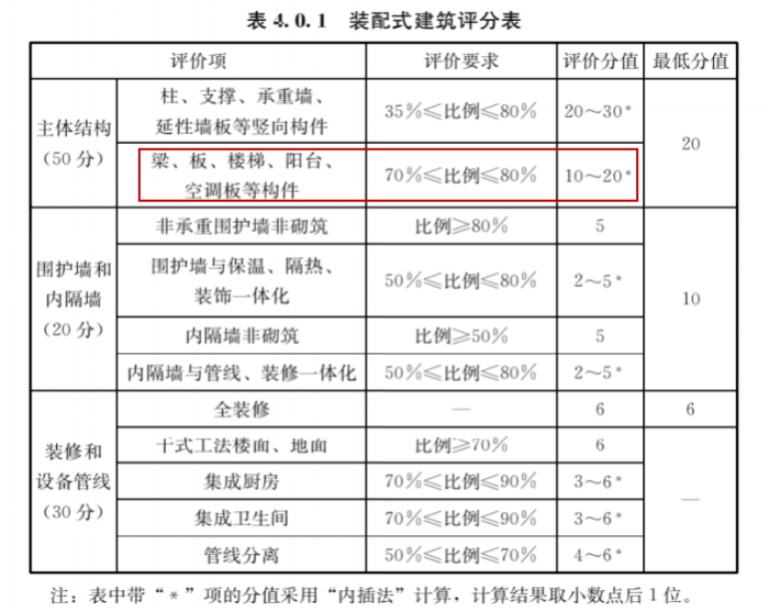 其中,國標評價標準是采用單體裝配率作為計分原則,單體裝配率要求不低于50分,其中36分是固定項分值。根據(jù)裝配方案選擇的不同,對應的混凝土預制率可在20%~30%左右浮動。