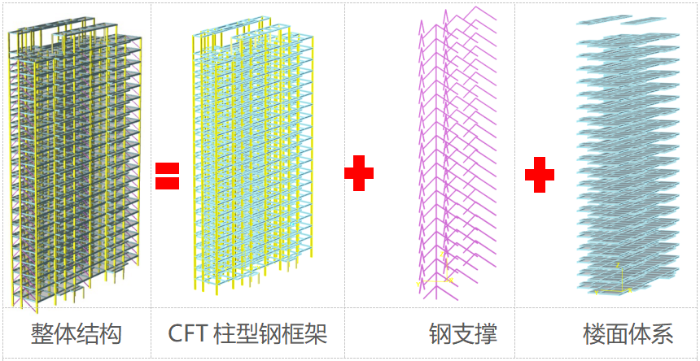 本項目鋼結構采用CFT柱型鋼框架-支撐體系。從圖2可以看出,鋼支撐布置在無窗外墻、分戶墻、樓梯間處,不影響建筑使用功能;鋼柱、鋼梁可暗藏于建筑墻體內(nèi),結構布置與建筑具有很高的匹配性,可為精裝修設計帶來便利。