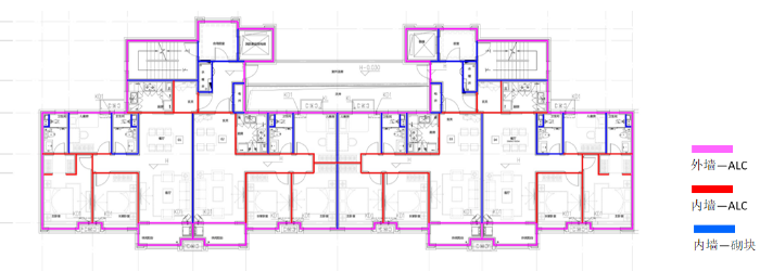 按評分細則,內(nèi)隔墻非砌筑比例需≥50%,采取ALC條板墻與局部砌塊墻相結合的做法。在公區(qū)、戶間墻、有水房間(廚衛(wèi))等區(qū)域采用砌塊墻,此外均選用ALC條板墻。