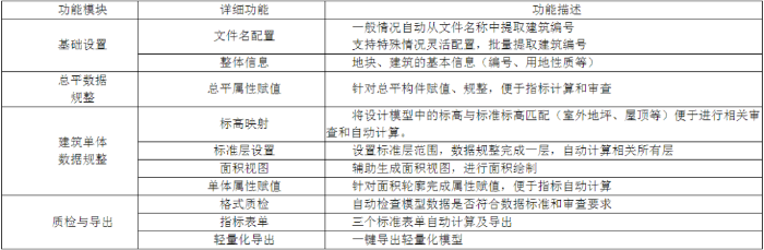 第二,總體系統(tǒng)包含建筑工程輔助設計軟件工具。基于主流BIM設計軟件Revit研發(fā)BIM規(guī)劃報建輔助設計軟件,擁有4大功能模塊,實現(xiàn)12項功能(如表1所示)。