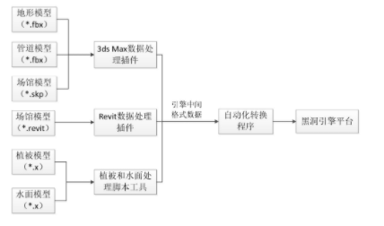 花博會項目模型主要包括整個園區(qū)多種格式的地形地貌模型、管道模型、場館模型、植被模型和水面模型,模型格式包括*.rvt、*.fbx、*.skp、*.3ds等,以及在SpeedTree中建立的三百余種植被模型,平臺分別對上述模型進行數(shù)據(jù)處理后統(tǒng)一進行渲染模擬。