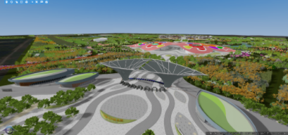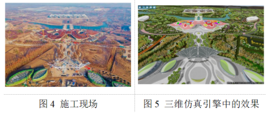 借助基于BIM+GIS的花博會三維可視化平臺可快速將設計好的場館模型進行三維可視化呈現(xiàn),并且可以通過多角度進行環(huán)境融合展示,從而提高方案可讀性和直觀性。在場館設計變更中,通過場館設計模型的直接調(diào)整就可通過展示平臺快速呈現(xiàn);在樹木分布方案變更中,通過三維可視化樹種庫來完成樹種1:1的數(shù)字化模擬,為園區(qū)樹木分區(qū)優(yōu)化提供了有力技術(shù)支持。