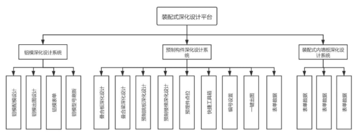 2.在軟件功能架構(gòu)設計方面,平臺包含了裝配式建筑設計的三大系統(tǒng),預制構(gòu)件深化設計系統(tǒng)共有9個模塊,27個功能,鋁模深化設計系統(tǒng)共有4個模塊,21個功能,裝配式建筑內(nèi)墻板深化設計系統(tǒng)共有3個模塊,8個功能,可以實現(xiàn)快速建模、一鍵出圖、一鍵生成物料清單表等功能。
