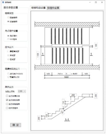 (2)預制樓梯拆分及深化設計。本項目選用標準樓層的梯段板作為樓梯的標準構(gòu)件,采用120mm厚度的預制雙跑樓梯,預制樓梯采用高端支承為固定鉸支座,低端支承為滑動鉸支座的裝配方案。通過預制構(gòu)件深化設計系統(tǒng)中預制樓梯深化設計的樓梯放置功能,設置樓梯參數(shù)后(如圖9所示),把預制樓梯放置在模型中。