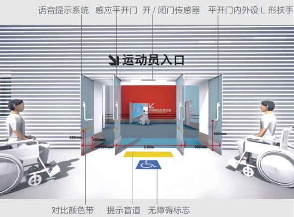 作為全國唯一專門服務于殘疾人的冰上運動體育場館,項目需要發(fā)揮引領(lǐng)性的作用,不僅要滿足一般性的無障礙設(shè)計,更需要高于標準的人性化優(yōu)化設(shè)計。通過對使用人群日常行為的分析,研究人員發(fā)生各類行為時的人體尺度和行為模式,思考需要提供無障礙設(shè)計的各個方面及優(yōu)化細節(jié)。從場地規(guī)劃、空間布局、流線組織、設(shè)施設(shè)備、標識系統(tǒng)、避險避難六大體系開展設(shè)計,總結(jié)出通用的無障礙設(shè)計策略,以及針對此體育場館特有的無障礙設(shè)計策略,為運動員的訓練參賽、生活輔助等打造全面的人性化環(huán)境。