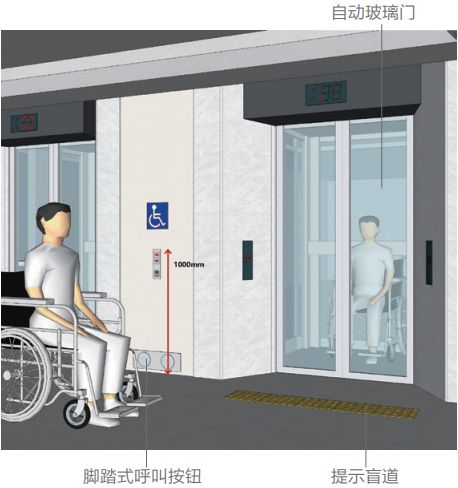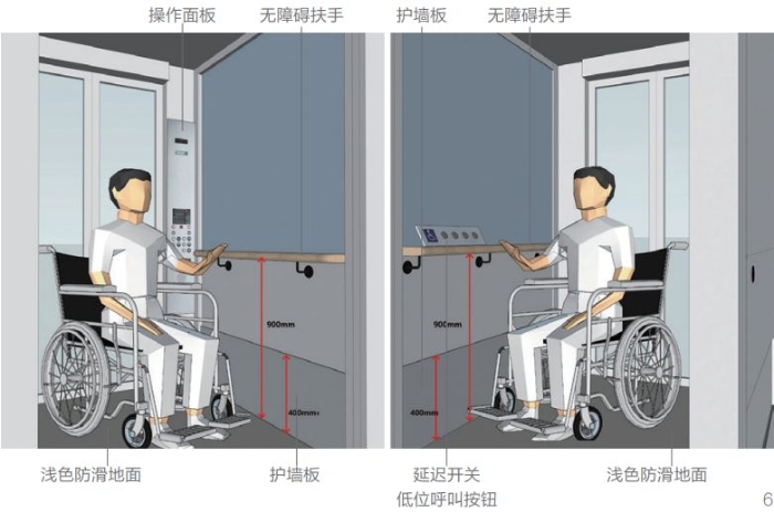 轎廂的三面壁上設(shè)高900mm扶手。轎廂內(nèi)部的設(shè)計與安裝要避免造成傷害,不存在尖角或凸出物。轎廂內(nèi)三面采用鏡面不銹鋼,可將轎廂環(huán)境盡收眼底。輪椅進出時,能通過鏡面觀察周圍情況,進退自如。轎廂操縱盤布置在進入轎廂時的右側(cè)轎壁,主操控盤的轎廂斜對角位置設(shè)置殘疾人轎廂操縱盤,使殘疾人進入轎廂后無需再轉(zhuǎn)身按鍵(圖6)。