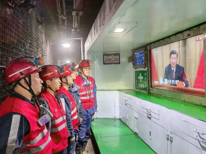 ▲ 在國(guó)家能源集團(tuán)神東煤炭大柳塔煤礦52606工作面,綜采一隊(duì)的青年礦工圍在控制臺(tái)防爆電腦前聆聽(tīng)總書記講話。