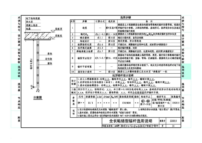 本圖集針對每種類型的錨桿都給出了選用步驟,也給出了對應(yīng)的標(biāo)準(zhǔn)格式的設(shè)計說明,設(shè)計師只需按步驟填寫表格,將“抗浮錨桿設(shè)計說明”表附在施工圖中,即完成了總說明和構(gòu)造詳圖(防腐、防水等節(jié)點)的繪制。