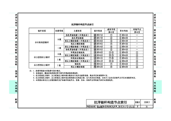 本圖集給出不同類型抗浮錨桿在不同防腐等級要求下,采用不同筋體時的構(gòu)造詳圖、防水構(gòu)造以及預(yù)應(yīng)力錨桿的封錨節(jié)點詳圖。