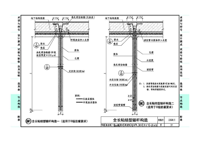 例如,本頁是全長粘結(jié)型錨桿適用于Ⅱ級防腐時的構(gòu)造詳圖,如果筋體選用熱軋帶肋鋼筋,可直接將“第37頁QM1”標(biāo)注于總說明表格中,防水節(jié)點大樣也同時被引用,方便施工單位按照本節(jié)點進(jìn)行施工。