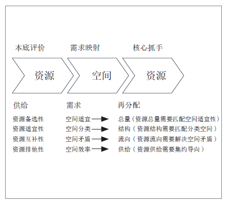 突出空間格局作為資源配置重要依據(jù)的治理邏輯,建立“資源—空間—資源”的治理邏輯鏈條,按照定量化、空間化、精準化的技術(shù)標準,強調(diào)客觀、真實的資源本底評價,遵循自然地理格局、歷史演進規(guī)律和經(jīng)濟發(fā)展規(guī)律,明確空間需求和空間矛盾,進而指導資源的科學再分配,實現(xiàn)空間格局的優(yōu)化,促進人、地、水的匹配和國土空間生態(tài)、經(jīng)濟、社會的綜合效益最大化?;谫Y源與空間的邏輯閉環(huán),通過空間維度回答資源分配的取和舍問題,通過時間維度回答資源利用的緩和急問題,通過治理維度回答資源利用的輕和重問題(圖2)。