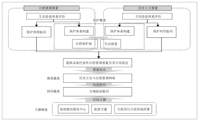 堅持高質(zhì)量的空間品質(zhì),以針對三類空間的不同高標準指標來管控空間質(zhì)量,保障空間有序發(fā)展。在城鎮(zhèn)空間中,重點強調(diào)用地集約、高效,重視提升城鎮(zhèn)空間綠色、宜居等品質(zhì)。在農(nóng)業(yè)空間中,強調(diào)推進農(nóng)用地綜合整治和高標準農(nóng)田建設(shè)帶動農(nóng)業(yè)空間質(zhì)量的提升。在生態(tài)空間中,從保護、觀賞、利用和支撐4個維度入手,強調(diào)高標準管控和提升綜合價值。在保護維度上,增加新增國土修復(fù)面積、自然保護地面積等。在觀賞維度上,強調(diào)在嚴格保護的基礎(chǔ)上,綜合自然景觀要素和歷史文化要素評價,形成歷史文化與自然景觀網(wǎng)絡(luò)。從利用維度上,重點構(gòu)建全域旅游格局,突顯歷史文化和自然景觀資源從綠水青山到金山銀山的價值轉(zhuǎn)化。從支撐維度上,通過文旅項目的點狀供地政策,形成能落地的空間支撐(圖6)。