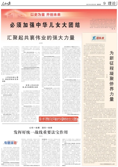 中華兒女大團(tuán)結(jié)是國(guó)家發(fā)展進(jìn)步的巨大優(yōu)勢(shì),是實(shí)現(xiàn)民族復(fù)興的強(qiáng)大力量。習(xí)近平總書記在慶祝中國(guó)共產(chǎn)黨成立100周年大會(huì)上的重要講話中強(qiáng)調(diào):“以史為鑒、開創(chuàng)未來,必須加強(qiáng)中華兒女大團(tuán)結(jié)?!毙碌恼鞒躺希^續(xù)創(chuàng)造屬于中華民族的共同輝煌,必須形成海內(nèi)外全體中華兒女心往一處想、勁往一處使的生動(dòng)局面,匯聚起實(shí)現(xiàn)民族復(fù)興的磅礴力量。人民日?qǐng)?bào)26日刊發(fā)的3篇文章,圍繞這一主題進(jìn)行闡述。