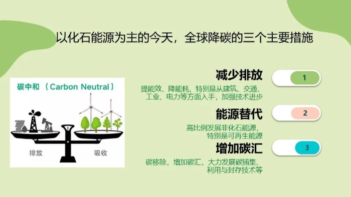 為實(shí)現(xiàn)“雙碳”目標(biāo),在以化石能源為主的今天,全球和中國降碳的主要措施有三條:第一,是減少排放,“提能效、降能耗”,特別是從建筑、交通、工業(yè)、電力等方面入手,加強(qiáng)技術(shù)進(jìn)步。第二,是能源替代,高比例發(fā)展非化石能源,特別是可再生能源。第三,是增加碳匯,“碳移除”增加碳匯,大力發(fā)展碳捕集、利用與封存技術(shù)等。