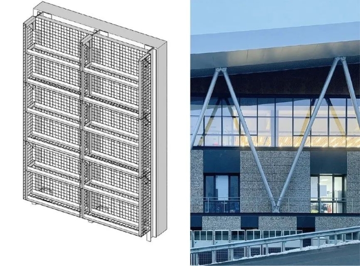 建筑外墻采用鋁板及門(mén)窗,結(jié)合貼實(shí)木皮的樹(shù)脂板、重新設(shè)計(jì)的建筑裝飾石籠墻以及耐磨混凝土地面和清水混凝土,構(gòu)成了建筑獨(dú)特的造型和外觀,形成國(guó)家雪車(chē)雪橇中心標(biāo)志。附屬建筑與遮陽(yáng)棚V形鋼柱、裝飾石籠墻、木瓦和清水混凝土等相互呼應(yīng),將整個(gè)雪車(chē)雪橇中心的賽道與場(chǎng)館整合在一起。其中裝飾石籠墻的石頭采取就地取材,即將場(chǎng)地挖出的石頭破碎而成。