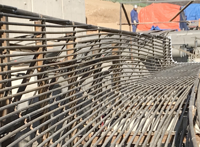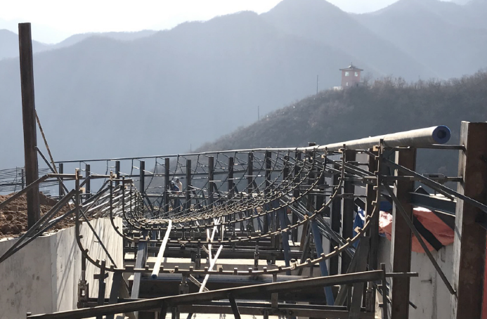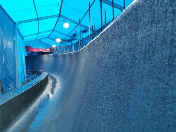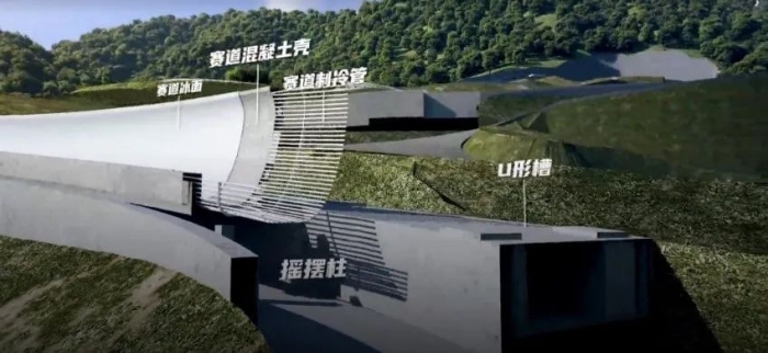 國(guó)家雪車(chē)雪橇中心采用世界頂尖的賽道設(shè)計(jì),賽道底部是一個(gè)U形槽,U形槽內(nèi)布置鋼筋混凝土搖擺柱支撐賽道。賽道設(shè)計(jì)成復(fù)雜的空間三維曲面,其找形與內(nèi)部設(shè)置的卡具息息相關(guān),建設(shè)彎道時(shí),會(huì)按照賽道的形狀布置相應(yīng)的卡具,在卡具上鋪設(shè)制冷管(卡具和制冷管道是賽道的骨架和血液),然后再鋪設(shè)經(jīng)過(guò)特殊處理的鋼筋網(wǎng)片,最后設(shè)置找平管。并采用噴射混凝土成型。在賽道外側(cè)設(shè)置保溫層,冬季比賽和訓(xùn)練時(shí)賽道內(nèi)側(cè)澆筑50mm厚的冰面。