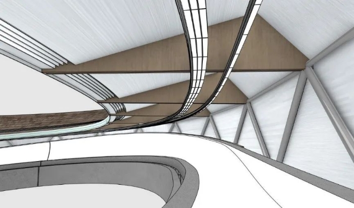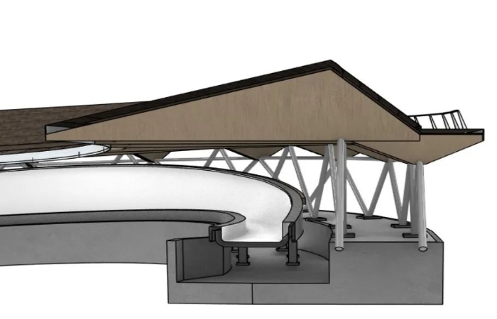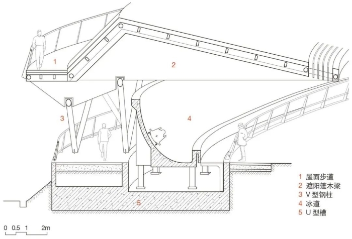 與其他國(guó)家賽道不同,國(guó)家雪車(chē)雪橇中心增加了一個(gè)賽道遮陽(yáng)屋頂,其遮陽(yáng)棚主體結(jié)構(gòu)采用了全球首創(chuàng)的鋼木組合單邊懸挑結(jié)構(gòu)體系,單邊最大懸挑長(zhǎng)度12.65m。鋼筋混凝土U形槽、V形鋼柱、木梁、木瓦屋面共同組成了為冰道遮光擋雨的遮陽(yáng)棚系統(tǒng)。