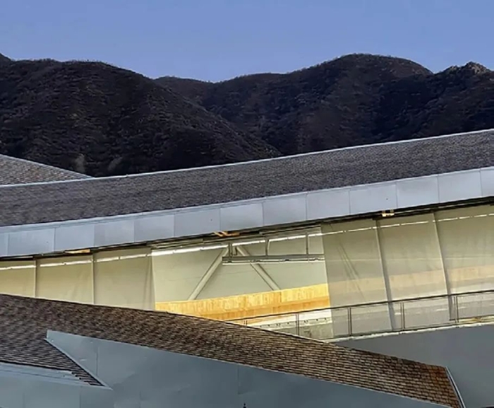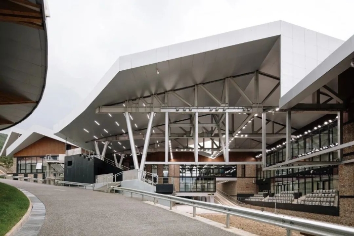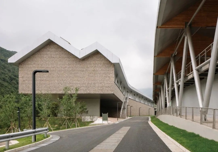 國(guó)家雪車(chē)雪橇中心以賽道為核心,通過(guò)相同的坡屋面將分散布置的出發(fā)區(qū)、結(jié)束區(qū)、制冷機(jī)房、訓(xùn)練道冰屋、運(yùn)營(yíng)和后勤綜合區(qū)各建筑串聯(lián)在一起。