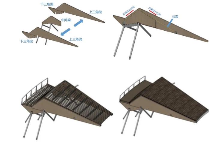 在遮陽(yáng)棚木梁的尾端根據(jù)結(jié)構(gòu)的受力特點(diǎn)設(shè)置分散應(yīng)力的倒三角小木梁,滿(mǎn)足結(jié)構(gòu)合理受力的同時(shí),在遮陽(yáng)棚的尾部形成了可沿屋面通行的屋頂步道,在賽時(shí)可供工作人員的通行、檢修,在賽后步道則作為景觀步道向大眾開(kāi)放,游客可以在屋頂?shù)母叨刃蕾p到更加廣闊的景色。