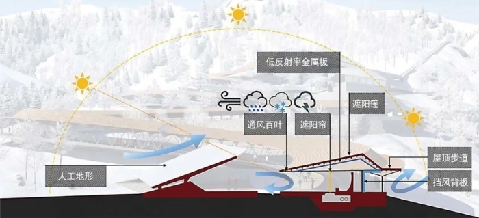 國(guó)家雪車(chē)雪橇中心場(chǎng)館選址S2地塊位于山體的南坡而非大多數(shù)場(chǎng)館的北坡,相比北坡,南坡賽道的氣候條件更為嚴(yán)苛。對(duì)于賽道而言,太陽(yáng)輻射特別是直射輻射會(huì)導(dǎo)致部分冰面軟硬不一,直接影響賽道的安全性和運(yùn)動(dòng)員的競(jìng)技水平,制冷能耗也會(huì)隨之攀升。李興鋼設(shè)計(jì)研究團(tuán)隊(duì)提出了讓雪車(chē)雪橇場(chǎng)館“南坡變北坡”的設(shè)計(jì)策略,使處于南坡的雪車(chē)雪橇中心節(jié)能效率不低于北坡。結(jié)合賽道形狀、自然地形和人工地形、遮陽(yáng)屋頂、遮陽(yáng)設(shè)施(遮陽(yáng)簾及擋風(fēng)背板)等,研發(fā)出“地形氣候保護(hù)系統(tǒng)”(Terrain Weather Protection System,簡(jiǎn)稱(chēng)“TWPS”),有效保護(hù)賽道冰面,降低氣候因素對(duì)賽道的影響,確保賽事高質(zhì)量進(jìn)行,并最大限度降低能源消耗。