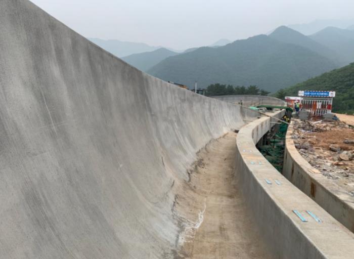 國(guó)家雪車(chē)雪橇中心的賽道長(zhǎng)1975m,高差超100m,由16個(gè)角度、傾斜度各異的彎道組成。通過(guò)防震縫分為47段,僅有10段是直線(xiàn)段,其余都是曲線(xiàn)段,最長(zhǎng)賽道段長(zhǎng)度達(dá)70m。賽道為空間扭曲雙曲面殼體結(jié)構(gòu),賽道結(jié)構(gòu)表面平整誤差要控制在1毫米以?xún)?nèi),且結(jié)構(gòu)中則預(yù)埋了近11萬(wàn)米的制冷管線(xiàn),用于通冷制冰。為確保賽道高速比賽的安全性,賽道不同滑面內(nèi)部均要達(dá)到相同的密實(shí)度和表面空間成型精度。