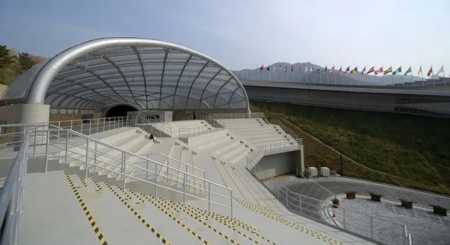 遮陽(yáng)棚在賽道前區(qū)有一道遮陽(yáng)簾,簾子做了加長(zhǎng)的處理,簾子外面有一層反光的材質(zhì),上面有一些微小的孔洞,提升透光率和通透性,同時(shí)對(duì)風(fēng)阻也有一定減小,能保護(hù)賽道免受沙塵、風(fēng)雪的影響;在賽道的背側(cè),設(shè)置了一個(gè)固定的擋風(fēng)板,可以有效解決山間夜晚風(fēng)大的問(wèn)題。