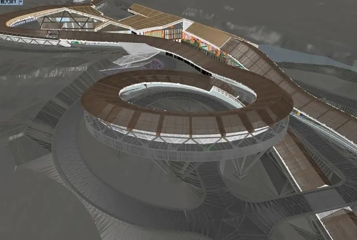建筑BIM設(shè)計(jì)與場(chǎng)地BIM同時(shí)開(kāi)展,并和場(chǎng)地BIM設(shè)計(jì)一同形成了兩條主線(xiàn):建筑BIM設(shè)計(jì)以雪車(chē)雪橇賽道及附屬建筑為主線(xiàn)開(kāi)展建筑模型的搭建;場(chǎng)地BIM設(shè)計(jì)以場(chǎng)地豎向設(shè)計(jì)、賽道U型槽、車(chē)行道、伴隨路及場(chǎng)地巖土構(gòu)件為主線(xiàn)開(kāi)展場(chǎng)地模型的搭建。兩條獨(dú)立的線(xiàn)索在后續(xù)場(chǎng)館整體BIM設(shè)計(jì)中,通過(guò)各自不同的方式開(kāi)展設(shè)計(jì)和建模,但兩條主線(xiàn)始終互相共享數(shù)據(jù)、互相校核并且最終實(shí)現(xiàn)了模型的整體融合。