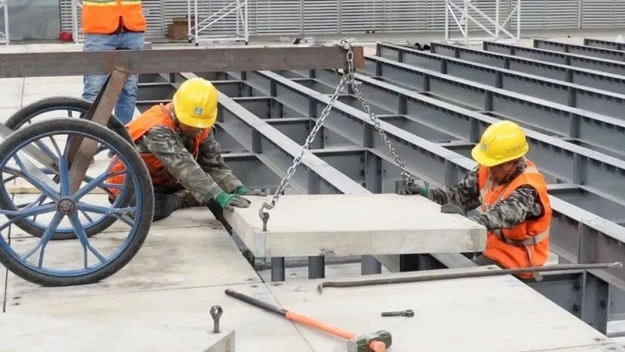 從“水”到“冰”,看起來就是加上“兩點”這樣簡單。但現(xiàn)實卻恰恰相反,冰壺場地是公認(rèn)的對冰面質(zhì)量要求極高的運動項目。除了對冰面光滑度和平整度的要求,對整體環(huán)境中溫濕度、照明、聲音傳播、空氣流動等都具有很高的要求。“水冰轉(zhuǎn)換”實際上是一項大工程。首先,要對游泳池進(jìn)行“填坑”,泳池里的水抽干以后,設(shè)計團(tuán)隊要根據(jù)坑底平面的荷載能力去搭建可轉(zhuǎn)換架體,設(shè)計師們在試了木頭、鋼筋等多種材料以后,選擇了目前鋼結(jié)構(gòu)加輕質(zhì)混凝土預(yù)制板結(jié)構(gòu)體系。