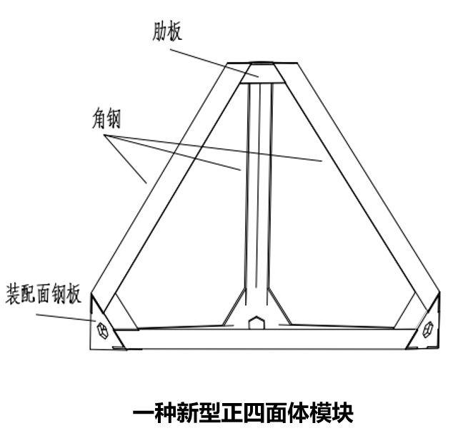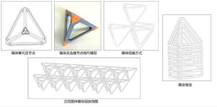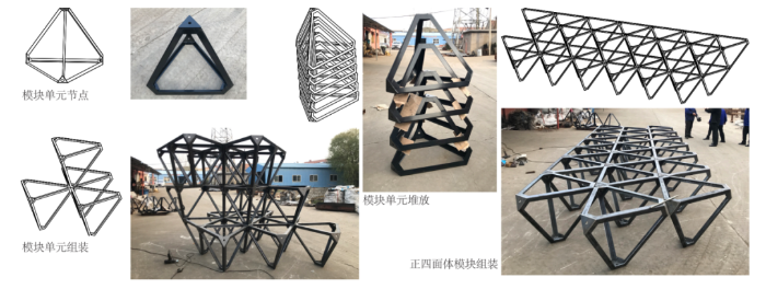 四面體模塊和模塊之間的連接,最開始考慮過扣件式,還考慮過球形節(jié)點(diǎn)、螺栓球節(jié)點(diǎn)。因?yàn)樾枰M裝還需要拆卸,所以不能用焊接的方式,只能用機(jī)械的方式。后來發(fā)現(xiàn),以上種節(jié)點(diǎn)方式雖然可行,但是可靠度,還有施工難度,包括安裝速度都難以達(dá)到最佳效果,所以在研發(fā)過程中,采用了現(xiàn)在的這種和模塊同樣體型的正四面體的節(jié)點(diǎn)。
