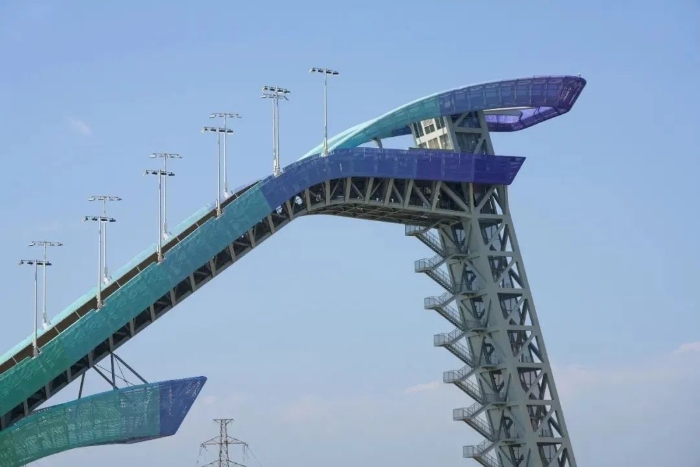 大跳臺主體結(jié)構(gòu)為鋼結(jié)構(gòu),呈西北-東南方向布局,主體結(jié)構(gòu)長度160m,最大寬度30m,高度60.05m,賽道結(jié)構(gòu)彎折飄逸。