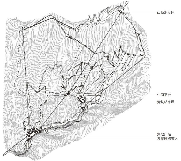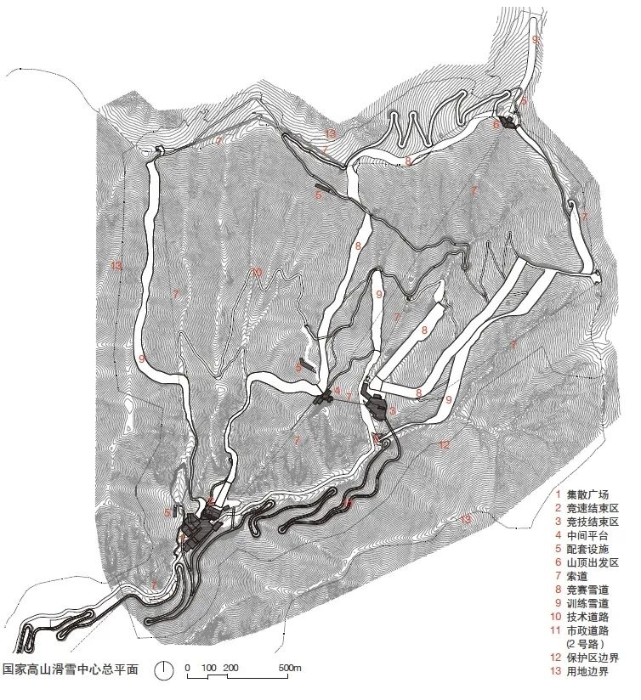 國家高山滑雪中心是國內(nèi)第一座按冬奧賽事標(biāo)準(zhǔn)建設(shè)的高山滑雪場館,將進(jìn)行北京冬奧會和冬殘奧會高山滑雪所有項(xiàng)目的比賽,共設(shè)有3條競賽雪道、4條訓(xùn)練雪道以及其他聯(lián)系雪道和技術(shù)雪道,各類雪道總長度約為23.1km,最大垂直落差約925m,最大坡度達(dá)68度。賽區(qū)內(nèi)設(shè)置競速與競技兩個結(jié)束區(qū),容納核心功能的永久建筑及臨時(shí)設(shè)施分散布局,圍繞雪道規(guī)劃形成集散廣場及競速結(jié)束區(qū)、競技結(jié)束區(qū)、山頂出發(fā)區(qū)等主要建設(shè)區(qū)域。