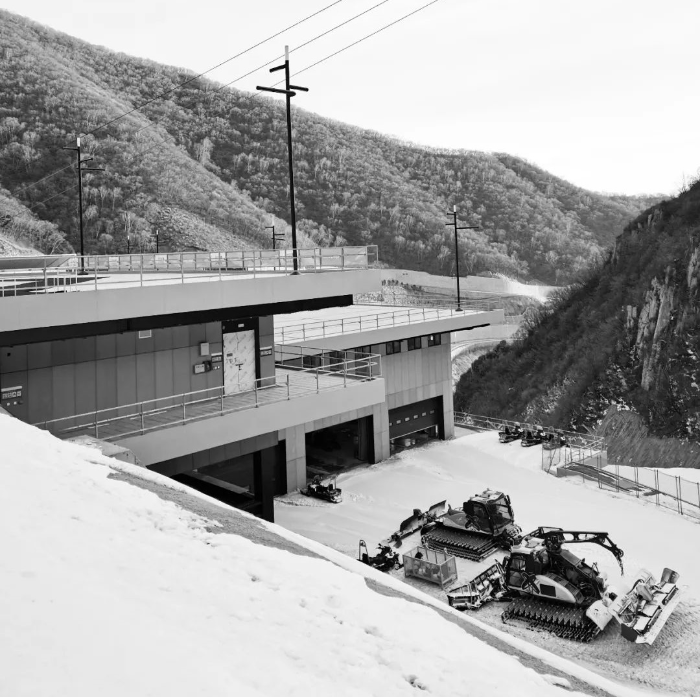 國家高山滑雪中心采用相對設(shè)施化的建筑語言反映了“低調(diào)而消隱”(Low-pitched and Hidden)的設(shè)計(jì)態(tài)度。對材料品類的篩選提煉也是對山地建筑完成度的控制策略;考慮山地運(yùn)輸及安裝條件,預(yù)先做了小尺度的板塊劃分,板材多采用開縫處理,減少施工工序;山地環(huán)境類別和嚴(yán)寒氣候分區(qū)要求設(shè)計(jì)對材料耐候性、耐久性、抗凍性、吸水率等相關(guān)技術(shù)參數(shù)嚴(yán)格控制;扶梯、電梯相應(yīng)采取桁架內(nèi)及井道內(nèi)設(shè)置加熱設(shè)備來應(yīng)對高山環(huán)境可能出現(xiàn)的極寒天氣;對停車及壓雪車過車平臺混凝土面層材料的抗鹽凍性要求進(jìn)行了專家論證,采用F50抗凍混凝土配筋面層切實(shí)可行的解決方案。