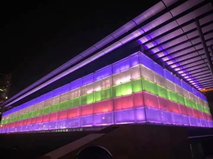 將180噸壓花玻璃牢牢固定在龍骨架上并且經(jīng)久耐用,采用氟碳漆鋼龍骨,大幅提升抗腐蝕性,使用壽命從20年提升為30年。此外,還采用6毫米龍骨架,使承載力提升;新型點(diǎn)式玻璃駁及系統(tǒng),增加玻璃固定點(diǎn)數(shù)量,縮小駁接件尺寸,最大限度增加“冰磚城堡”的透光效果。在燈光配合下,一塊塊晶瑩剔透的壓花玻璃將壘砌出“冰堡”的效果。