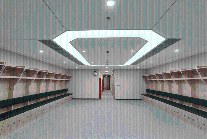 座椅是為冰球項(xiàng)目特殊設(shè)計(jì)的,座椅并不是垂直于地面而是有一個(gè)傾角,這樣做是為了滿足運(yùn)動(dòng)員穿著冰鞋時(shí)方便收腿。這個(gè)座椅的下面,設(shè)計(jì)了一個(gè)可掀起的座板,里面能夠方便存儲(chǔ)裝備。柜子上還設(shè)計(jì)了3個(gè)通氣孔,能夠防止裝備長(zhǎng)時(shí)間悶在密閉空間里變潮。25套更衣柜環(huán)形擺放,也是為了教練員能夠和全部隊(duì)員無(wú)障礙溝通,在更衣室的內(nèi)部把全部的注意力集中在戰(zhàn)術(shù)布置上。