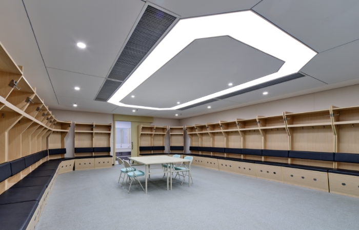 冰球更衣間占地面積2819平方米,由14個(gè)更衣室單元、2個(gè)公共制冰室、1個(gè)公共磨刀室組成。每個(gè)更衣單元包括運(yùn)動(dòng)員磨刀室、儲(chǔ)藏室、衛(wèi)生間、淋浴室、按摩室、教練室、更衣室各一間。